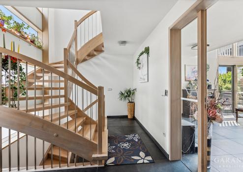 Die Ausstattung überzeugt durch Schreinerarbeiten: maßgefertigte Treppen, Türen und Bäder verleihen dem Interieur zeitlose Eleganz. Praktische Details wie ein Wäscheabwurfschacht vom Ober- ins Erdgeschoss erleichtern den Alltag.