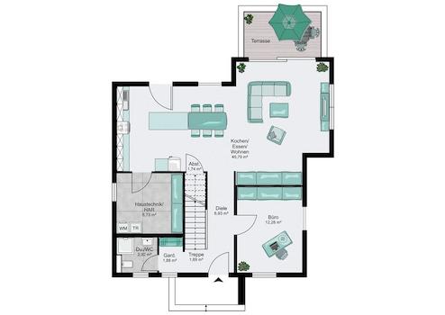 Das hier gezeigte Planungsbeispiel ist in der Ausbaustufe FastFertigPlus dargestellt. Diese beinhaltet keine Wand- und Bodenbeläge in Wohn- und Schlafräumen. Die Sanitärräume sind bereits gefliest und mit Sanitärobjekten ausgestattet. Eine schlüsselfertige Ausführung ist ebenfalls möglich - ganz nach Ihrem Budget.