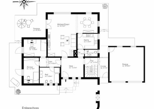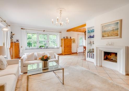 Ein weitläufiges Wohnzimmer mit gemütlichem Kamin, ein Esszimmer, die Küche sowie zwei Schlafräumen und ein großes Bad, das mit Wanne und separater Dusche ausgestattet ist, bilden mit der großen Diele und dem Gäste-WC den Grundriss im Erdgeschoss. Von hier aus hat man Zugang zum Garten. Der überdachte Freisitz vor dem Wohnzimmer lädt zum Frühstücken oder geselligen Beisammensein im Freien ein.