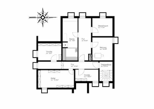 Die beiden Wohnungen im Obergeschoss sind unterschiedlich groß: Die größere umfasst ca. 60 m² und besteht aus einem Schlafzimmer, einem Bad, einer Diele, einem Wohnzimmer, einer Küche, einem Balkon sowie einer Kammer. Die zweite Wohnung ist ca. 20 m² groß und besteht aus einem Zimmer (z.B. Büro), einem Duschbad sowie einem Flur. Der Keller beherbergt die Heizung, eine Sauna sowie vier große Kellerräume, die viel Stauraum bieten. Zur Ausstattung gehören zudem eine Doppelgarage, die im Haus integriert ist, sowie drei zusätzliche Stellplätze seitlich vor dem Haus.
