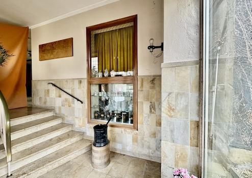 Der helle Hausflur stellt mittels einer Marmortreppe die Verbindung in das Obergeschoss her und gewährt den Zugang in die Wohn- und Nutzräume des Erdgeschosses.