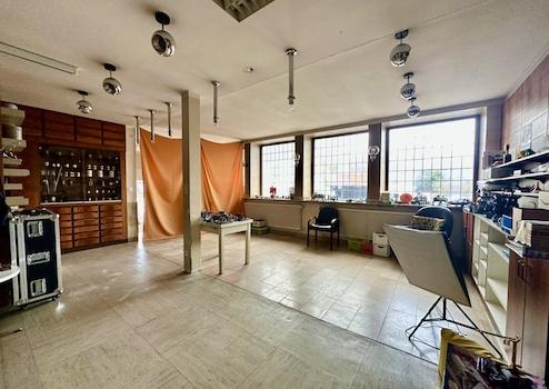 Das Erdgeschoss bietet zur Zeit zwei verschiedene Bereiche: Zum einen den Wohnbereich mit einer Küche und anschließendem Wohn- Essbereich, sowie eine Garderobe und ein Gäste-WC, sowie die Waschküche; zum anderen befindet sich hier im vorderen Gebäudebereich der ehemals gewerbliche genutzte Teil des Hauses mit dem Büro und der großzügig verglasten Ladenfläche und verschiedenen Nebenräumen.