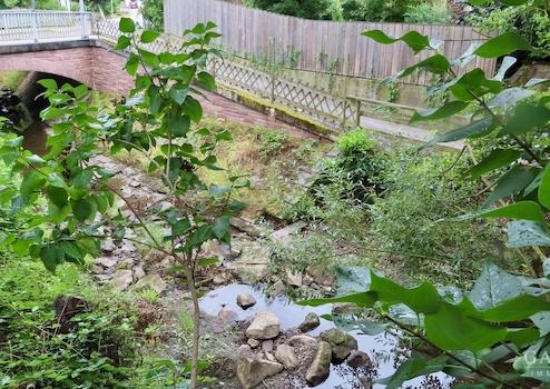 Der Garten grenzt an den Bocksbach und liegt am Skulpturenweg von Pfinztal.