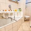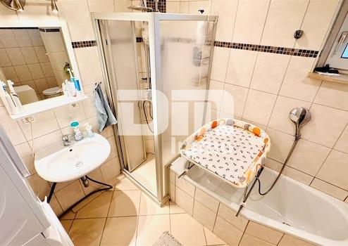 Das Tageslichtbad mit Dusche, Wanne und Waschmaschinenanschluss wurde 2010 saniert und punktet mit hellen Fliesen in zeitlosem Design.