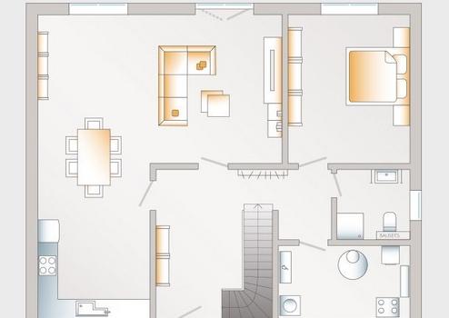 Das behagliche Haus mit Satteldach punktet mit einem gut durchdachten Grundriss. Der offen gestaltete Wohn-/Ess- und Kochbereich ist lichtdurchflutet. Ein praktischer Hauswirtschaftsraum ist direkt neben der Küche platziert. Komplettiert wird das Raumangebot im Erdgeschoss mit einem Gäste-WC, das optional auch als Duschbad ausgeführt werden kann, einer Diele und einem Haustechnikraum.