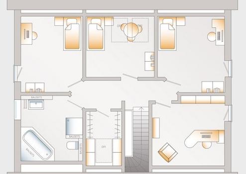 Im Dachgeschoss des Hauses sind zwei schöne Kinderzimmer, ein Elternschlafzimmer, ein Flur und ein Familienbad untergebracht. Die Lage der Treppe und des Haustechnikraumes sind fixiert.