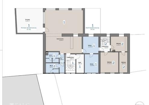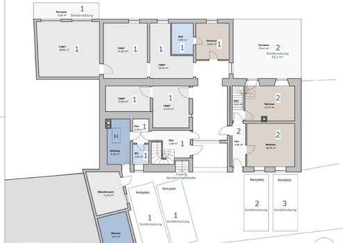 Laut Teilungserklärung (2022) gliedert sich die Fläche wie folgt: