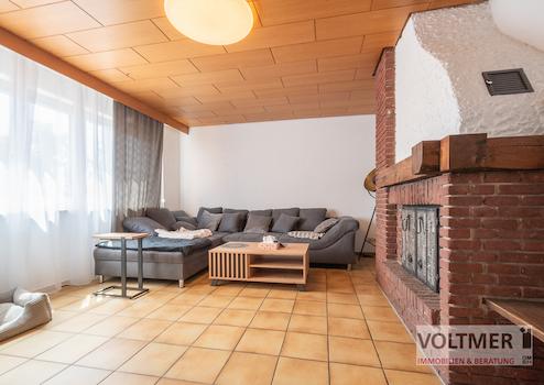 > großes Wohnzimmer mit Kamin & Zugang zum überdachten Balkon