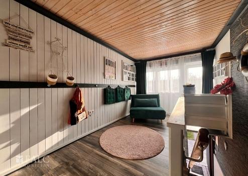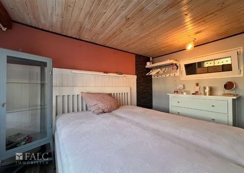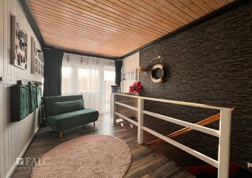 Im Obergeschoss erwartet Sie ein geräumiges Wohnzimmer oder alternativ ein zweites Schlafzimmer. Dieser Raum bietet direkten Zugang zu einem kleinen Balkon, von dem Sie einen schönen Blick auf das Wasser und die Umgebung genießen können – ideal für entspannte Stunden im Freien.