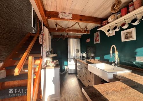 Im Eingangsbereich des Bootsschuppens befindet sich eine gut durchdachte Küche, die den Raum praktisch und funktional nutzt. Eine Treppe führt in das Obergeschoss. Direkt neben der Küche gibt es eine kleine Abseite, die sich ideal für die Lagerung von Vorräten oder als zusätzlicher Stauraum eignet. Die Bootsgarage ist großzügig dimensioniert mit einer Standardgröße von 6,00 m x 2,25 m /2,5m, wobei eine Erweiterung auf 6,5 m möglich ist. Dies ermöglicht eine größere Flexibilität für die Unterbringung von Booten oder anderen Fahrzeugen.