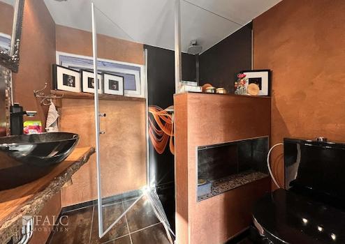 Das Bad im Obergeschoss ist modern ausgestattet und verfügt über eine bodengleiche Dusche, ein WC und ein Waschbecken. Die Funktionalität und die hochwertige Ausstattung sorgen dafür, dass der Raum sowohl komfortabel als auch pflegeleicht ist.