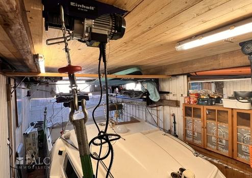 Flexible Bootsgarage: Die Garage hat eine Größe von 6,00 m x 2,25 m, mit der Option auf Erweiterung, wenn der Steg entfernt wird – ideal für größere Boote.
