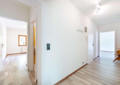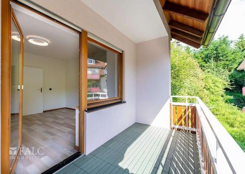 Über den Flur betreten Sie links das helle Wohnzimmer. Die großen Fenster sorgen für einen guten Lichteinfall. Von hier aus gelangen Sie auf den großen Balkon, auf dem Sie manchen Abend in Ruhe ausklingen lassen werden.