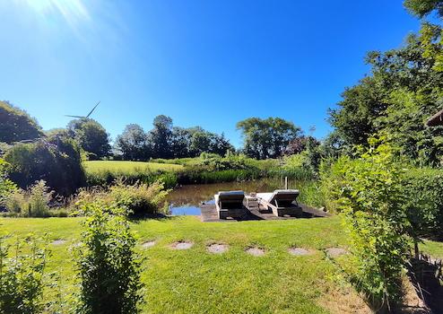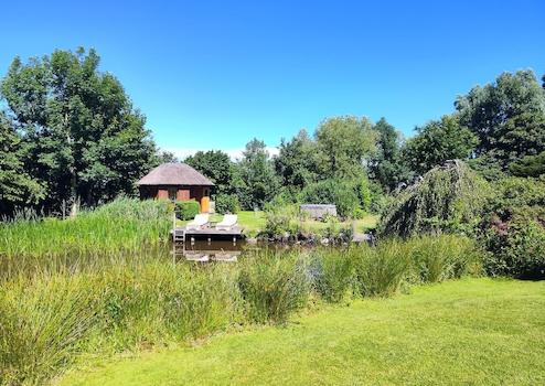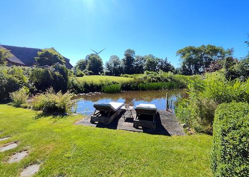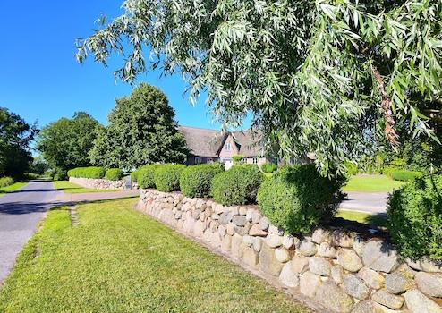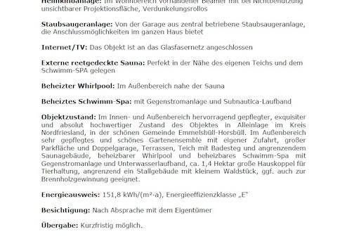 Dieses Gebäude ist ein sehr attraktiv gestaltetes, exquisit und hochwertig ausgestattetes reetgedecktes EFH mit großzügigen Räumlichkeiten, durchdachtem Ausbau und reetgedeckter großer Doppelgarage. In der luxuriös gestalteten Gartenanlage, die überaus geschmackvoll und dekorativ mit ausgewählten Pflanzen versehen ist, finden wir u.a. drei Außenterrassen, das neuwertig anmutende reetgedeckte Saunagebäude, sowie einen eigenen kleinen Teich mit Badesteg nebst Ruhebereich und einen beheizbaren Whirlpool, sowie ein beheizbares Schwimm-SPA mit Gegenstromanlage und Subnautica-Laufband. Im hinteren Bereich des Gartens befindet sich angrenzend die große Hauskoppel und ein Stallgebäude. Wer möchte, kann hier leicht Pferde oder andere Tiere halten oder die Fläche natürlich auch anderweitig nutzen.
