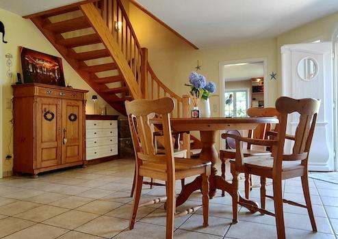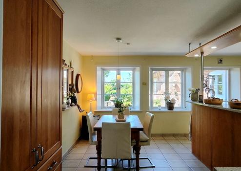 Im großen Esszimmer sehr dekorativer Kaminofen und kleiner Holzlagerplatz. Große Empfangsdiele mit direktem Zugang zu fast allen Räumen und zur Treppe ins OG. Hervorragend ausgestattete Küche im EG und mehrere Terrassen und Ruheflächen im Außenbereich. Zentral in der Doppelgarage befindliche Staubsauganlage mit vielen Anschlüssen im Objekt. Internetanbindung durch Breitband-Glasfaseranschluss und Lage des Objektes in einer zukunftsorientierten Gemeinde. Warftlage, wunderschöner Panoramablick und Traufpflasterung mit „Katzenköpfen“