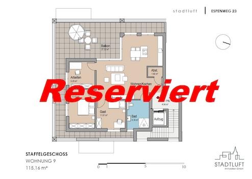 Diese großzügige 4-Zimmer-Penthousewohnung bietet auf 115,16 m² einen offenen Wohn-/Essbereich mit integrierter Küche, zwei Schlafzimmer, ein Arbeitszimmer sowie ein modernes Tageslichtbad mit Dusche. Zusätzlich verfügt die Wohnung über einen praktischen Abstellraum. Der helle Wohnbereich öffnet sich zu einem großzügigen Balkon mit 27,37 m², der ideal zum Entspannen im Freien einlädt.