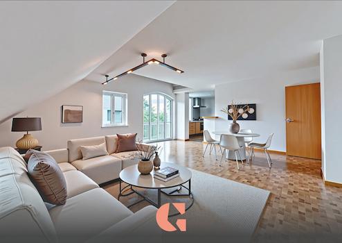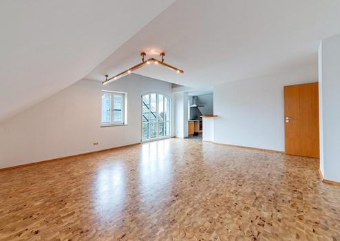 Willkommen in dieser lichtdurchfluteten Dachgeschoss-Galerie Wohnung in Garching, die modernen Wohnkomfort und ein einzigartiges Raumgefühl vereint.