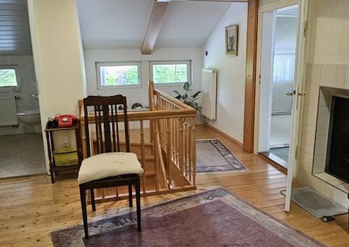 Der große Wohnbereich im 2. Obergeschoss besticht durch seine einladende Atmosphäre und die verschiedenen Bodenbeläge – Laminat, Fliesen und Teppichboden – schaffen ein warmes und angenehmes Wohngefühl. Ein Kamin im Wohnzimmer lädt zu gemütlichen Stunden an kühlen Abenden ein und sorgt für eine behagliche Wärme.