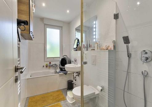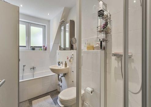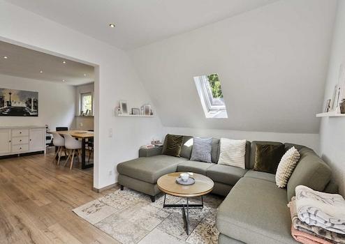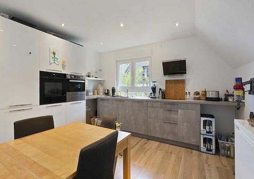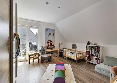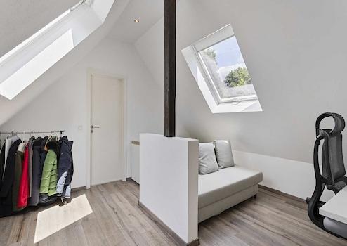Auf der Eingangsebene befinden sich zwei geräumige Schlafzimmer, die großzügige Küche, das Badezimmer und das Wohn-/Esszimmer. Der Spitzboden ist komplett ausgebaut (Baujahr 2015) und bietet zwei weitere Räume sowie ein Duschbad.
