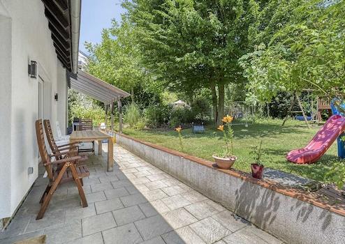 Der weitläufige Garten ist mit diversen Hecken, seitlichen Büschen und einer Rasenfläche versehen. Die vorgelagerte Terrasse ist teilweise überdacht und bietet einen tollen Blick ins Grüne. Hinzu kommt eine direkt ans Haus angebaute Doppelgarage.
