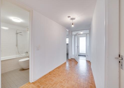 Über einen Laubengang mit Ausblick auf die Münchner Skyline gelangen Sie in die angebotene 2,5-Zimmer-Wohnung mit rund 72,62 Quadratmetern Wohnfläche.