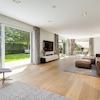 Die in allen Zimmern handgehobelten Maxidielen erzeugen im Zusammenspiel mit der kubischen Bauhausarchitektur eine wohlig-warme Atmosphäre. Elektrische Aluminium-Raffstores ermöglichen je nach Bedarf eine individuelle Feinjustierung der Lichtverhältnisse. Die deckenbündigen, matt-weißen Einbauleuchten und zahlreiche Lampen der Luxusmarke Occhio vervollständigen das durchdachte Belichtungskonzept des gesamten Hauses.