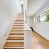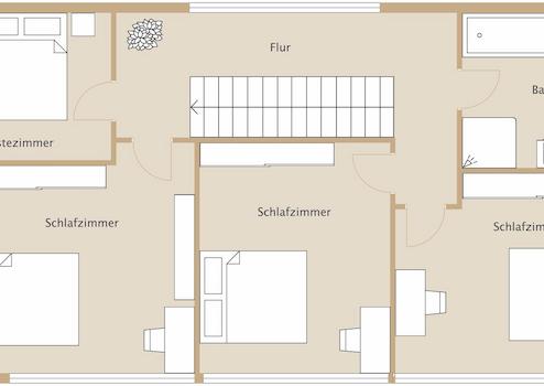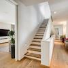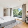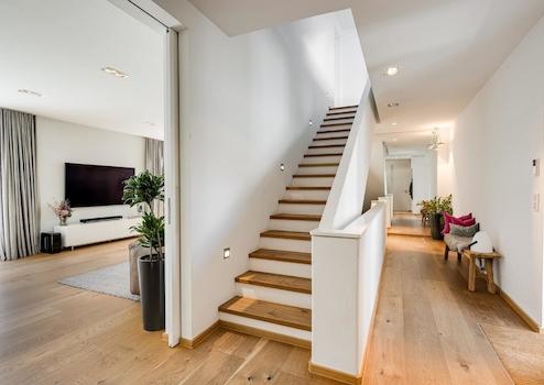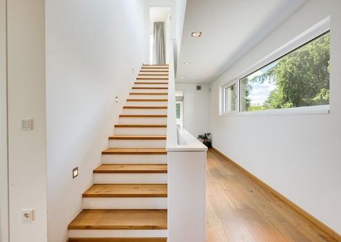 Über die mit Massivholz belegte Treppe mit Stufenbeleuchtung erreicht man die erste Etage. Herausragend ist hier die sich über die gesamte Fassadenseite erstreckende Fensterfront mit einer faszinierenden Gesamtlänge von zwölf Metern. Hier stehen vier gut geschnittene Zimmer zur Verfügung, die sich je nach Lebenssituation als Schlaf- und Gästezimmer oder als Home-Office anbieten.