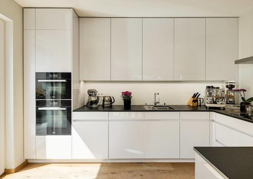 - Offene Hochglanzküche mit grifflosen Fronten