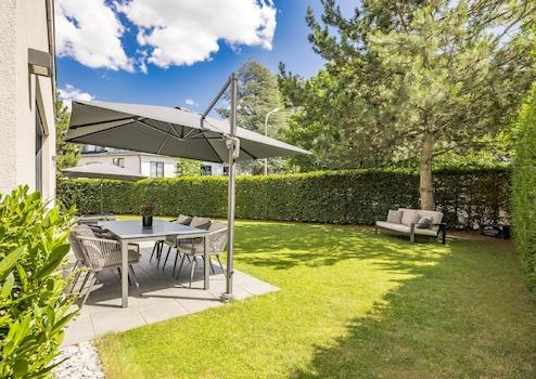 Der Außenbereich lädt dazu ein, an schönen Tagen auf der mit Naturstein gepflasterten Terrasse mit Familie und Freunden zu feiern und zu grillen. Mehrere zauberhafte Sitzecken sowie das sanfte Plätschern des Natursteinbrunnens schaffen im gesamten Garten Plätze für Ruhe und Entspannung.