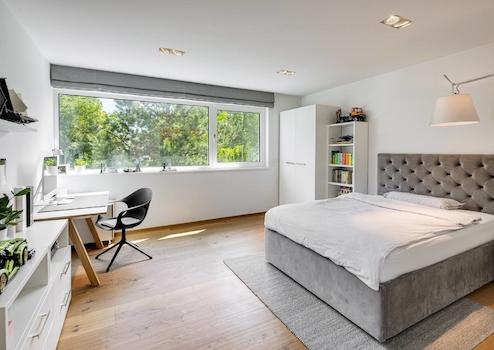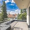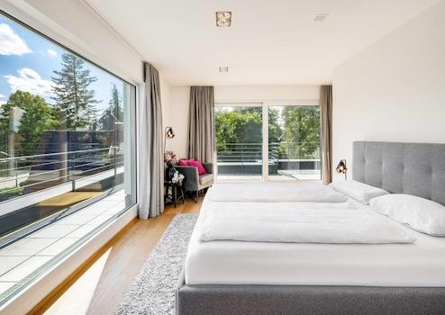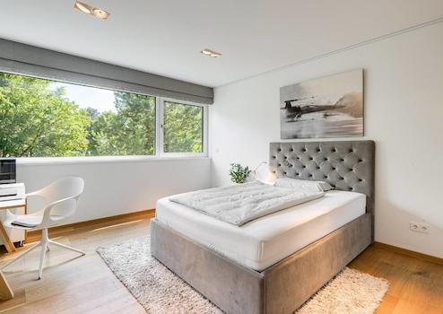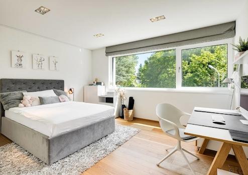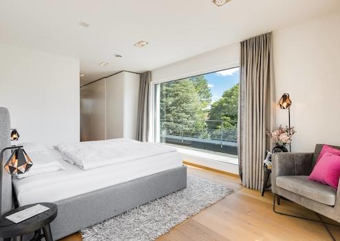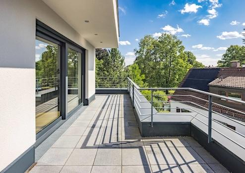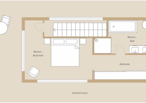 Die Penthouse-Ebene bietet mit dem Master-Bedroom, der Ankleide mit maßgefertigten Einbauschränken, dem Master-Bad und der Dachterrasse einen eigenen Wohnbereich, der keine Wünsche offen lässt. Die Panoramafenster mit Schiebetürelementen sorgen für eine einzigartige Symbiose des Schlafbereichs mit der Natur. Das Master-Bad bezaubert mit großformatigen italienischen Keramikfliesen, der großen Walk-In-Dusche mit Rainshower, der Badewanne und dem maßgefertigten wandbündigen Spiegelschrank.