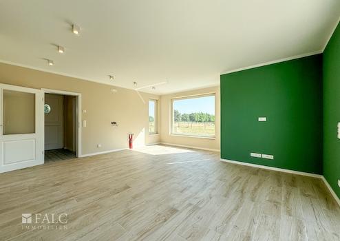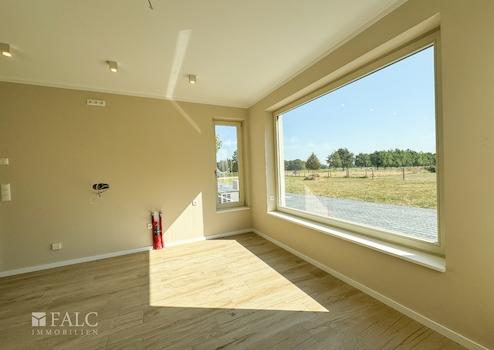 Der große Wohnbereich mit bodentiefen Fenstern ermöglicht einen wunderschönen Ausblick auf den liebevoll gestalteten Garten und lädt zum Verweilen ein. Der gut durchdachte Grundriss sorgt für eine optimale Raumaufteilung und eine angenehme Wohnatmosphäre.