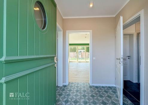 Vom Flur aus erwartet Sie ein großzügiger Wohnbereich mit großen Fensterfronten und direktem