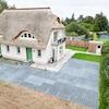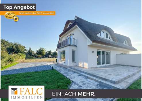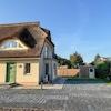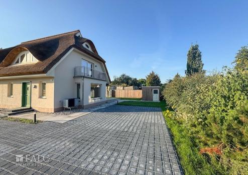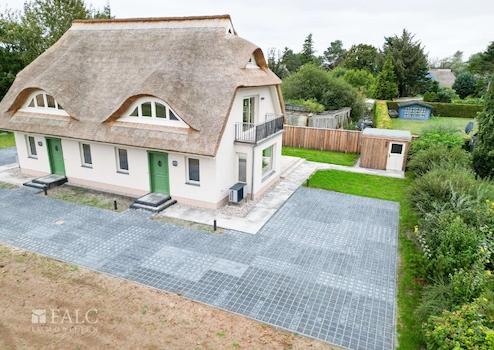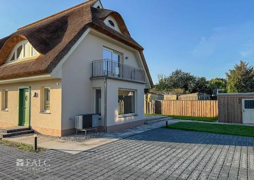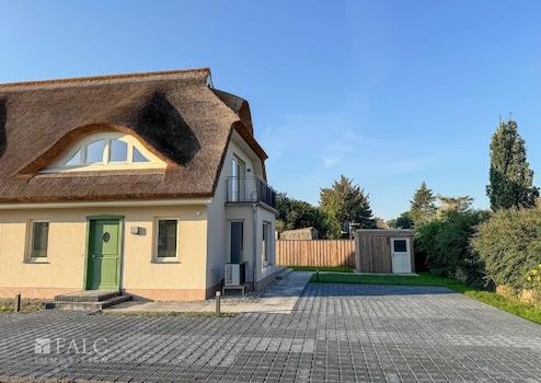 Die Doppelhaushälfte ist mit einem Rohrdach und einem charakteristischen Krüppelwalmdach mit