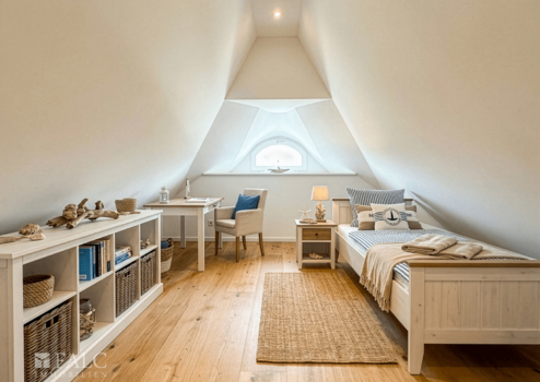 Der ausgebaute Spitzboden bietet zusätzlichen Wohnraum und ist als gemütliches Zimmer mit