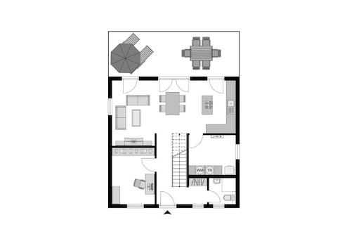 wäre bei Krankheit oder im Alter auch das Wohnen auf einer Etage möglich. Der Wohn-/Ess-/Kochbereich ist mit vier großen Terrassentüren ausgestattet und bietet viel Platz für die Familie. Die geradläufige Treppe strahlt Struktur und Modernität aus.