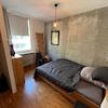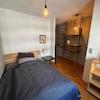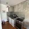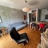 Modern eingerichtetes Wohnzimmer mit Ledercouch, Flatscreen-TV, Arbeits-/ bzw. Esstisch sowie Zugang zur sonnigen Süd-Loggia. Offen gestaltetes Schlafzimmer mit Stapelbett und Bücherregal. Ein Einbauschrank mit großzügigem Stauraum befindet sich im Flur. Vollständig eingerichtete Edelstahl-/Industrieküche im Wohnzimmer integriert mit vollwertigem Herd (nicht auf den Fotos zu sehen), Kühlschrank, Spülmaschine und Allem für den täglichen Bedarf.