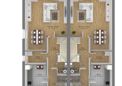 Die Häuser werden in solider, massiver Bauweise errichtet und mit modernster Haustechnik ausgestattet, um den Standard eines KfW-Effizienzhauses 55 zu erreichen. Dies bedeutet für Sie als zukünftige Bewohner nicht nur ein umweltfreundliches Zuhause, sondern auch erfreulich niedrige Nebenkosten. Nachhaltigkeit steht im Mittelpunkt: Jede Einheit wird mit einer effizienten Luft-Wasser-Wärmepumpe für die Fußbodenheizung und Warmwasserversorgung ausgestattet. Eine Photovoltaikanlage liefert umweltfreundlichen Strom für den Eigenverbrauch. Hochwertige Dreischeiben-Wärmeschutzverglasung und elektrische Rollläden runden das energieeffiziente Konzept ab.