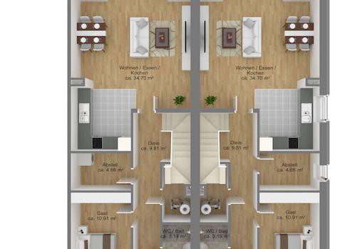 Die Preise für die Häuser beinhalten Fliesen in den Bädern und Haustechnikräumen mit einem Bruttomaterialpreis von € 35,-/m² Brutto. Die Maler- und Bodenbelagsarbeiten sind nicht im Kaufpreis enthalten.