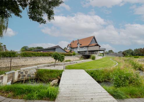 Das Grundstück, auf dem dieses prunkvolle Anwesen steht, wird durch den ruhigen Flusslauf der Hase und eine charmante Wehranlage, die seit Jahrhunderten besteht, abgerundet. Diese besondere Lage am Wasser verleiht dem Anwesen eine unvergleichliche Atmosphäre. Stellen Sie sich vor, Sie sitzen auf einer Ihrer großzügigen Terrassen, hören das sanfte Rauschen des Flusses und das Plätschern des selbst gebauten Wasserfalls – ein Gefühl von Ruhe und Geborgenheit, das seinesgleichen sucht.