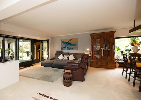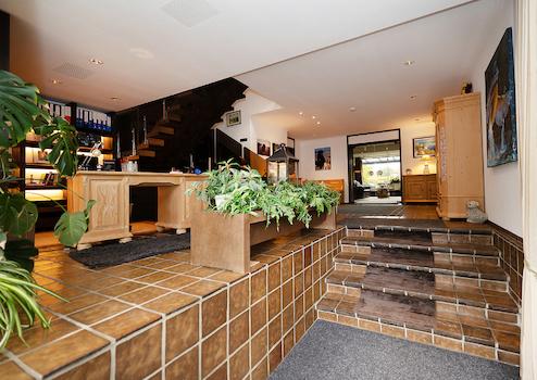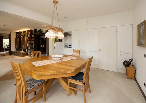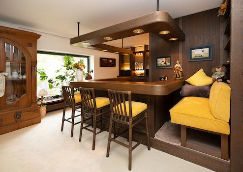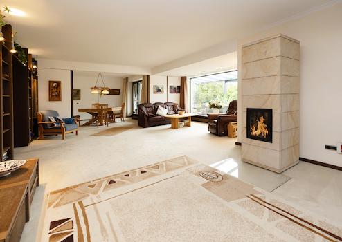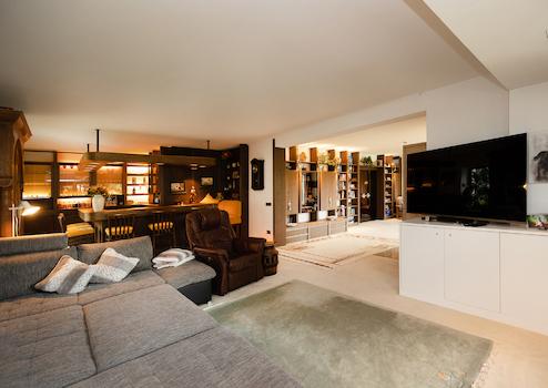 Der Eingangsbereich öffnet sich sanft in den großzügigen Wohnbereich, der durch stimmige Proportionen und eine harmonische Raumführung beeindruckt. Ein stilvoll gesetzter Kamin bildet den behaglichen Mittelpunkt dieses Lebensraumes – ein Ort, an dem sich Rückzug und geselliges Beisammensein auf ganz natürliche Weise begegnen. Die angrenzende Bar schafft Raum für unbeschwerte Stunden mit Gästen, während der Essbereich sich bei Bedarf durch Schiebeelemente vom übrigen Wohnraum abtrennen lässt – so entstehen sowohl Weite als auch Rückzugsorte ganz nach Wunsch.