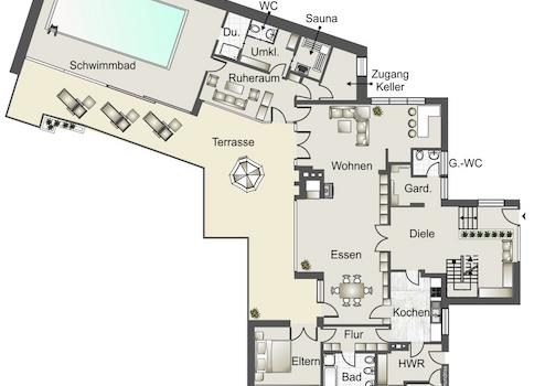 Ein Ort der Erholung erwartet Sie im hauseigenen Spa: Sauna, Infrarotkabine, Tauchbecken und Ruheraum schaffen eine Oase für Körper und Geist. Das Hallenbad schenkt zu jeder Jahreszeit die Möglichkeit zur aktiven Erholung oder zum entspannten Verweilen. Maßgefertigte Einbauschränke fügen sich dezent in die Wohnbereiche ein und unterstreichen den hochwertigen Anspruch dieses Hauses, ohne ihn in den Vordergrund zu drängen.