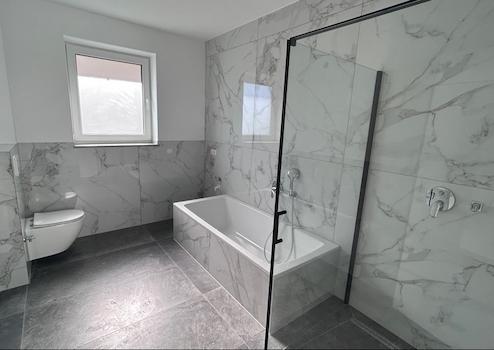 - 2 moderne Tageslichtbäder mit edlen Großformatfliesen