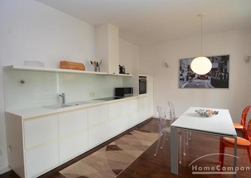 Die Wohnung ist komplett möbliert und bietet auf 50qm einen großzügiges Wohnzimmer mit offener Einbauküche mit Geschirrspüler.