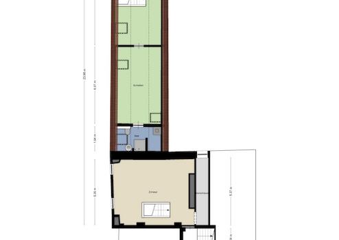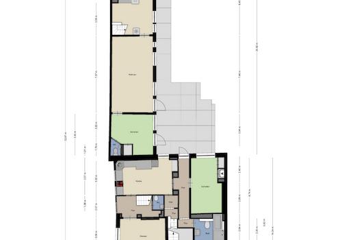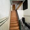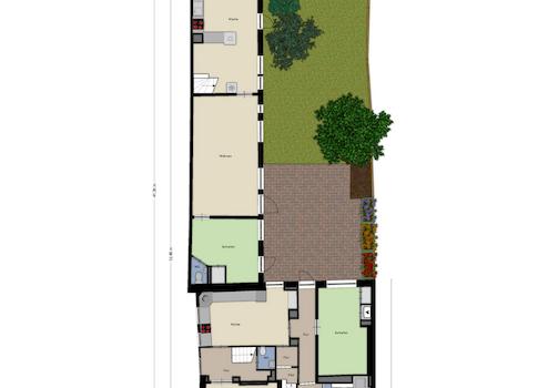 Die Erdgeschosswohnung kann durch den Hausflur sowie durch einen separaten Eingang auf der Rückseite betreten werden. Im Erdgeschoss des Vorderhauses befinden sich ein Schlafzimmer, ein Wohnzimmer, ein Kinderzimmer, eine Küche, ein Gäste-WC sowie mehrere Flure, die zu einem weiteren Schlafzimmer und einem Badezimmer führen. Ein Innenhof mit Terrasse und Garten steht dem Erdgeschossmieter ebenfalls zur Verfügung. Im Zwischengeschoss des Vorderhauses, das der Erdgeschosswohnung zugeordnet ist, befinden sich ein weiteres Schlafzimmer und ein Abstellraum.