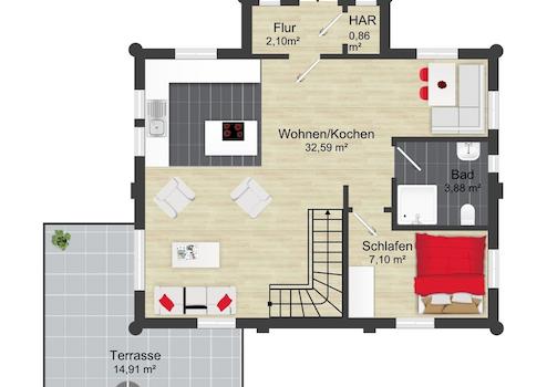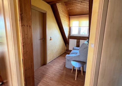 Das Ferienhaus bietet 4 Zimmer, eine Küche und zwei Bäder auf zwei Etagen. Im Erdgeschoss befindet sich das Wohn- und Esszimmer mit Zugang zur überdachten Terrasse, eine geräumige Küche und ein Duschbad.