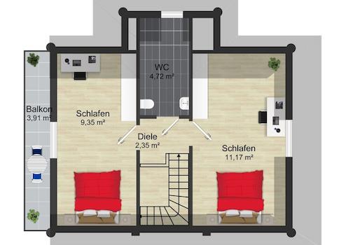 Das Dachgeschoss beinhaltet drei Schlafzimmer und ein Wannenbad mit Tageslicht. Jedes Zimmer hat Zugang zu dem überdachten Giebel-Balkon. Der Dachboden bietet zusätzlichen Stauraum.