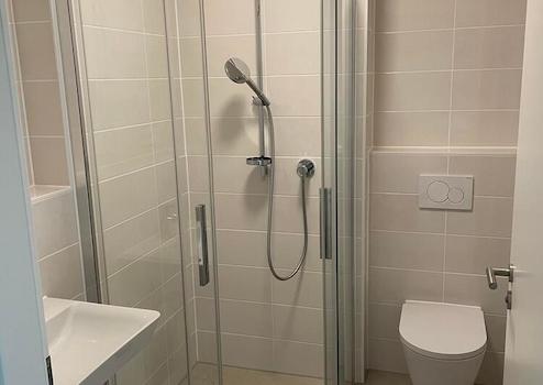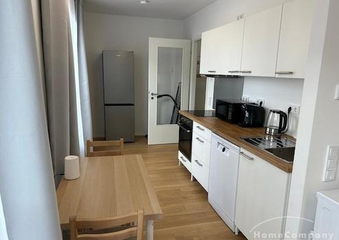 Dieses stilvolle Apartment bietet modernen Wohnkomfort in einem Neubau aus dem Jahr 2022. Die offene Küche ist voll ausgestattet und verfügt über eine Spülmaschine. Ein Essbereich für zwei Personen ist ebenfalls vorhanden.