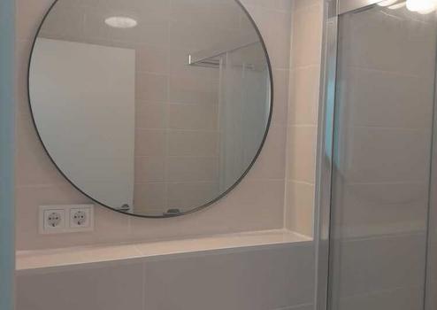 Der optisch abgetrennte Schlafbereich ist mit einem Doppelbett und einem Kleiderschrank möbliert. Das Badezimmer verfügt über eine moderne Dusche.