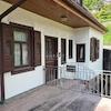 Am Eingang befindet sich ein große Holztür, der Zugang ist über eine Treppe möglich.