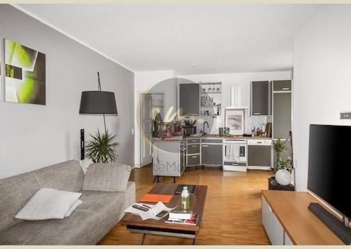 Die helle Wohnung selbst liegt im 2. Obergeschoss (vollständig zum ruhigen Innenhof ausgerichtet) und verfügt über zwei Zimmer, einen offenen Küchenbereich, ein großzügiges Tageslichtbad und einen Balkon, von dem man in den begrünten Innenhof blicken kann.